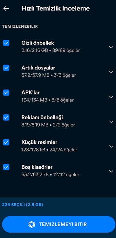 - Temizleme Seçeneklerini Gözden Geçirin: Tarama tamamlandığında, uygulama size ne kadar alanın boşaltılabileceğini ve hangi dosyaların temizlenmesi gerektiğini gösterir. Dosyaları seçip işaretleyerek temizlemek istediğiniz öğeleri belirleyin.