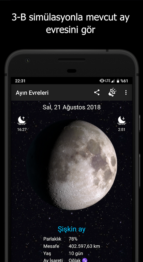 Ayın Evreleri APK indir uygulaması, Ay’ın evrelerini ve gökyüzündeki konumunu takip etmenizi sağlayan bir mobil uygulamadır. Bu uygulama, Ay’ın her evresinin ne zaman meydana geldiğini...