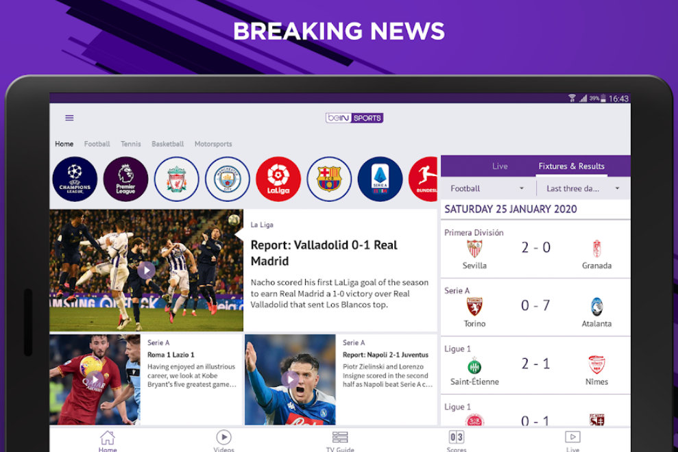 Android beIN SPORTS APK indir, en sevdiğiniz sporları, ligleri ve takımları seçerek beIN SPORTS TV üzerinden canlı maç izle, spor haberleri, videolar, özetler, puan durumu ve özel analizleri takip et.