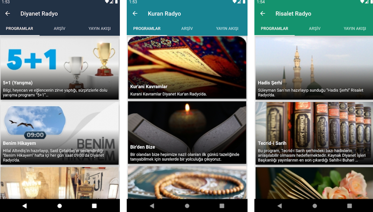 Diyanet Radyo TV, Diyanet’in kanallarına kolaylıkla ulaşmanızı sağlayan android uygulamasıdır. Minimum 4.2 android sürümü ve sonrasında çalışan uygulama farklı boyutlardaki ekranlara kolaylıkla uyum sağlar.