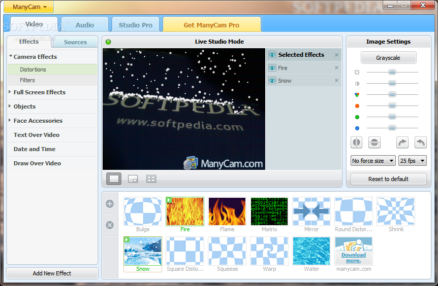 Hızlı video açabilmek ve videolar arasında hızlı geçişler yapabilmek için ManyCam Pro Studio Pro sekmesine gitmeniz gerekmektedir. ManyCam Pro 6 video kaynaklarını gösterir ve farklı kaynaklar arasında geçiş yeteneğini hızlandırır. ManyCam Pro ile canlı video prodüksiyon stüdyosu haline gelmesini sağlar bilgisayarınızın. Kendi özel web kameranız ile yeni efektler oluşturup dikkatleri üzerinize çekebilirsiniz. Etkiler, göz ağız ve saç efektleri grafik ayarını web cameranız ile oluşturabilirsiniz. Arkadaşlarınız ve ailenizle görüntülü konuşabilir özel efektler paylaşabilirsiniz.