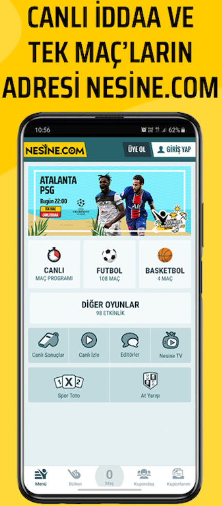 Nesine, tüm şans, bahis, basketbol, voleybol, at yarışı, Milli Piyango ve Süper Toto Canlı İddaa sonuçları uygulamasıdır. Nesine APK sürümünü indirip Nesine.com resmi Nesine APk dosyasını android telefon ve tabletler için İddaa Tahminleri uygulamasını ücretsiz indirin. Mobil veri veya Wi-Fi internet bağlantısı ile nerde olursanız olun İddaa sonuçlarını takip edebileceğiniz mobil İddaa uygulamasıdır.