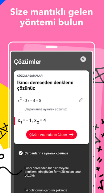 - Alternatif çözümler ve açıklamaları keşfedin: Uygulama, çözüm adımlarının yanı sıra alternatif çözüm yolları ve açıklamalar da sunabilir. Bu sayede kullanıcılar, farklı yaklaşımları keşfedebilir ve matematiksel kavramları daha geniş bir perspektiften ele alabilir.