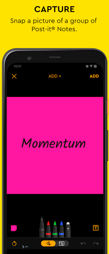 Post-it® uygulaması, kullanıcıların dijital Post-it® notlar oluşturmasına olanak sağlar. Kullanıcılar, farklı renklerdeki dijital notlar üzerine metin, resim veya el yazısıyla notlar alabilir. Bu notlar, gerçek bir Post-it® not gibi görüntülenir ve kullanıcının sanal bir çalışma alanında düzenlemesine izin verir.