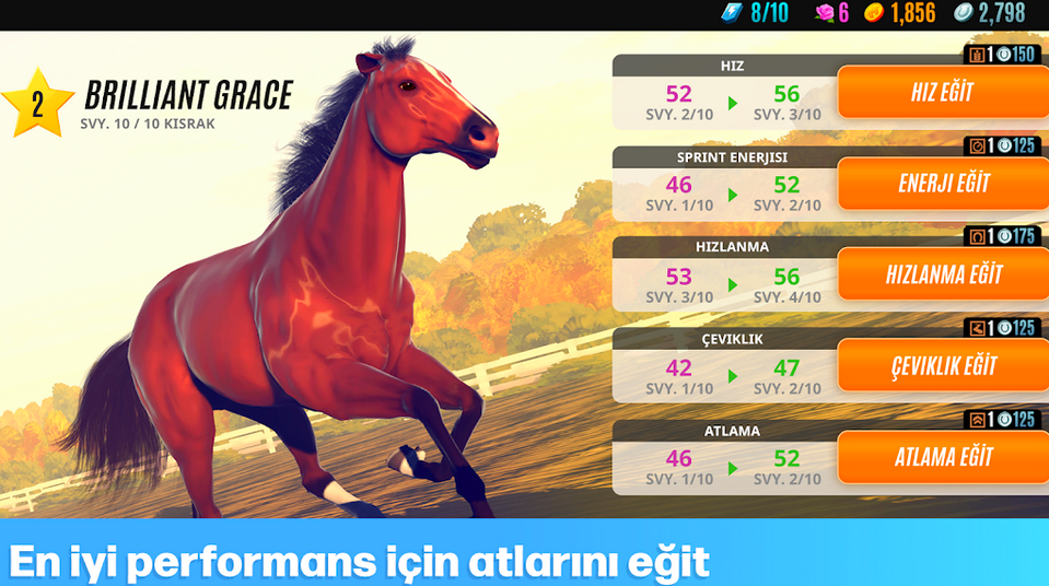 - At Eğitimi: Atlarınızın performansını geliştirmek için eğitim seanslarına katılabilirsiniz. Atlarınızın koşu hızı, dayanıklılığı, zekası ve enerjisi gibi farklı özelliklerini geliştirebilirsiniz.