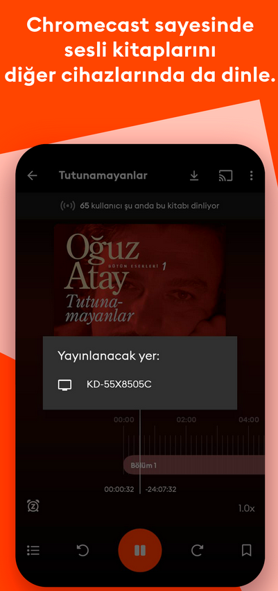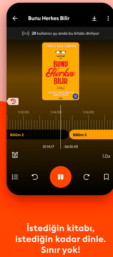 - Eğer “Dinle” seçeneğini seçerseniz, kitap veya sesli kitap otomatik olarak oynatılmaya başlar. İsterseniz hız ayarlarını değiştirebilir veya 15 saniye geri/al tuşları ile tekrar dinleyebilirsiniz. Ayrıca kitap işaretleme yapabilirsiniz.