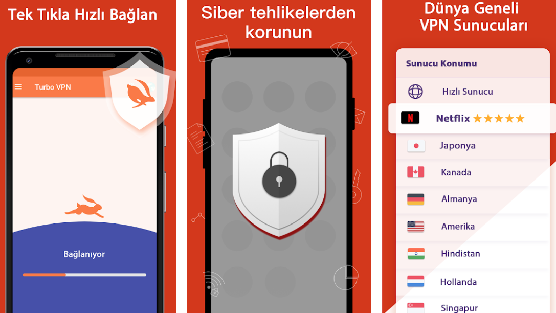 Özellikle toplu kullanıma açıp Wi-Fi ağlarına bağlarken güvenliğinizi sağlamak için Turbo VPN ücretsiz uygulamasını kullanmanızda fayda vardır. Uygulamanın içerisinde bölgeleri isteğinize uygun şekilde değiştirebilirsiniz. Ayrıca Netflix özelliği sayesinde Netflix platformunu en hızlı kullanabileceğiniz sunucuya geçiş yapmanız mümkündür.