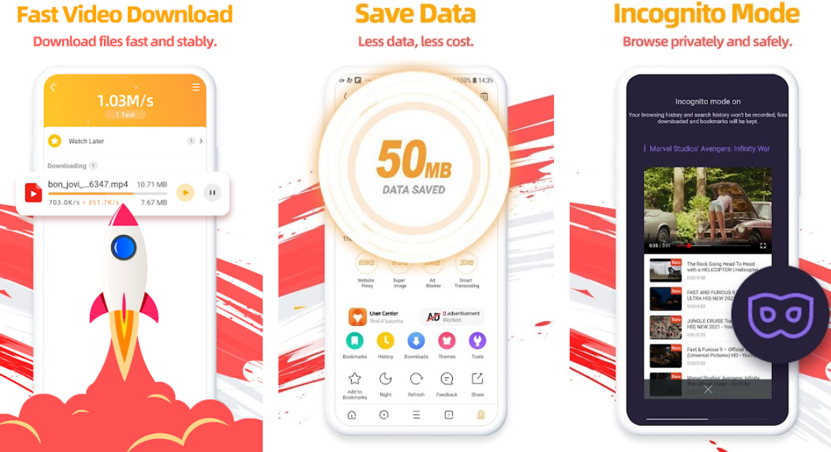 Bu özellik dışında gizli pencere açabilme, eklenti desteği, reklam engelleme özelliği, yer imleri yöneticisi gibi birçok fonksiyon bu tarayıcı içerisinde ücretsiz olarak bulunmaktadır. Bununla birlikte UC Browser – Uc Tarayıcı indirip en beğenilen özelliklerinin başında yarıda kalan indirme işlemi esnasında bağlantı kopması halinde, bağlantı geri geldikten sonra indirme işlemi kaldığı yerden devam eder ve herhangi bir kayıp yaşanmaz.