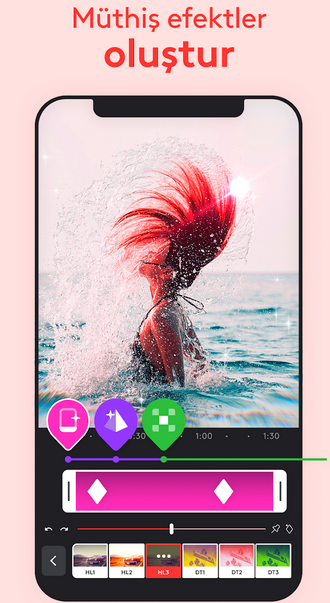 - Efektler ve filtreler ekleyin: Videonuza stil ve atmosfer katmak için efektler ve filtreler ekleyebilirsiniz. Uygulama genellikle bir “Efektler” veya “Filtreler” sekmesi sunar. Buradan istediğiniz efekti seçebilir ve videonuza uygulayabilirsiniz.